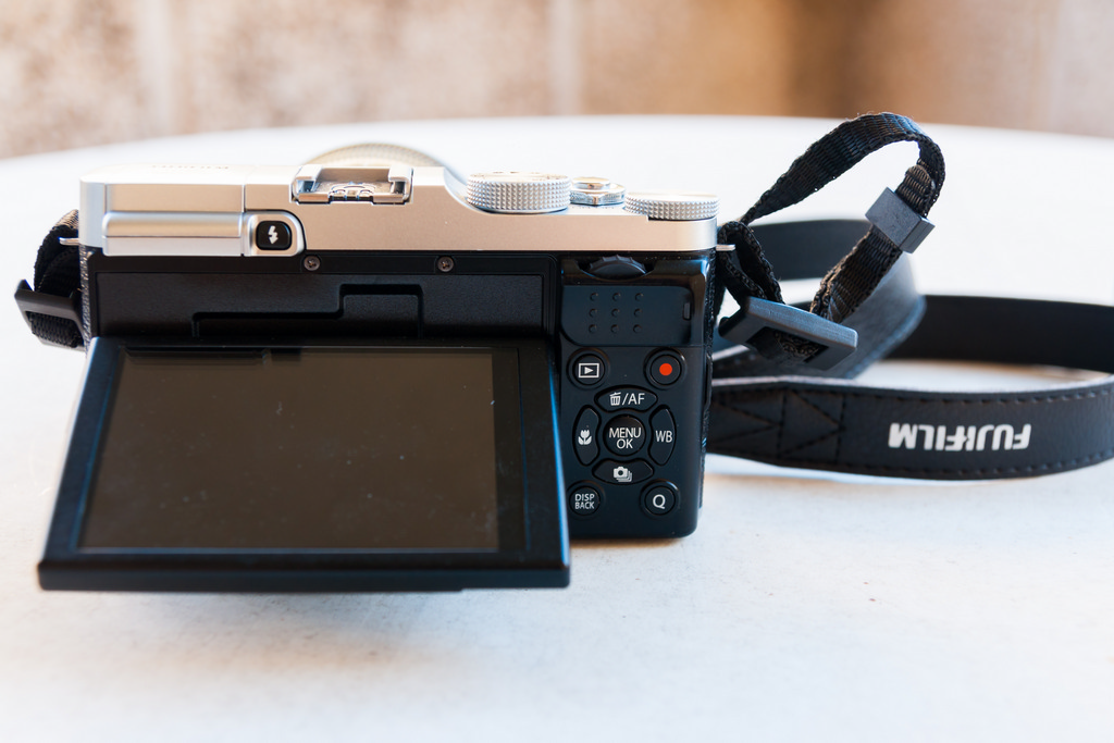 Ya en la parte trasera, disponemos de la pantalla abatible con un sistema de bisagras artículadas, el díal trasero de control, en una posición un tanto extraña, una botonera en forma de joystick circular, común en muchos fabricantes, el botón de acceso directo a la grabación de video, marcado con un círculo rojo, el de revisión de la imágenes, el pulsador disp/back, para retroceder en los menús y seleccionar la información que deseamos visualizar en pantalla y el particularmente útil botón «Q», tradicional de Fuji y que nos dará paso a un menú rápido con los ajustes más habituales, como modo de enfoque, sensibilidad ISO, modo de disparo, etc.