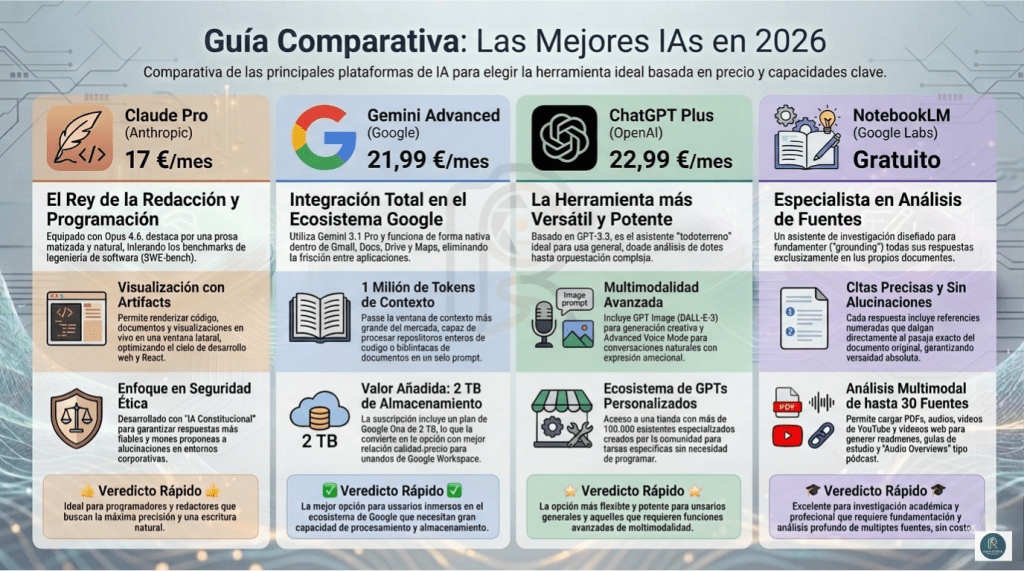 Usar una sola herramienta de inteligencia artificial para todo es como usar el mismo objetivo para toda una sesión fotográfica: técnicamente funciona, pero estás ignorando herramientas que harían el trabajo mejor. Gemini, Claude, ChatGPT y NotebookLM tienen fortalezas muy distintas, y combinarlas bien es más útil que elegir la «mejor» y punto. Esta guía va dirigida a profesionales del marketing digital y la fotografía que en 2026 ya usan alguna de estas herramientas y quieren sacarles más partido sin necesariamente gastar más.